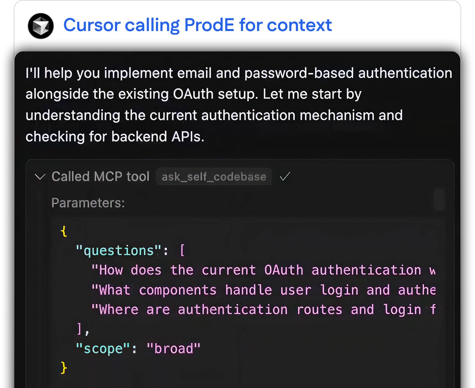 Solution: ProdE lets you ask natural-language questions and get answers grounded in the codebase, so you can see capabilities, integration complexity, and tech debt without interrupting devs.